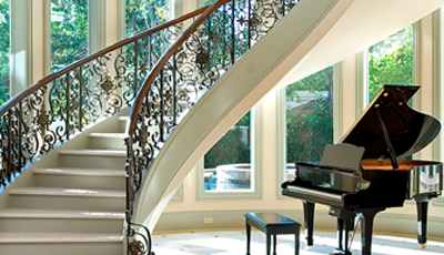Regency Railings has developed an innovative and patented series of prefabricated hand forged decorative ironwork components expressly for home builders and wood stair companies. You now have the opportunity to offer a custom designed, hand forged iron railing system at a fraction of the cost. This innovative balustrade system is beyond compare. The designs presented within our website were developed to be installed directly into a closed stinger staircase and wooden handrail to eliminate all need for welding. Regency Railings' components are not designed to be installed directly into stair treads. If you are still specifying open stringers, you now have a reason to change. Regency Railings offers components for virtually any staircase, regardless of radius or slope, and any level railing regardless of radius.